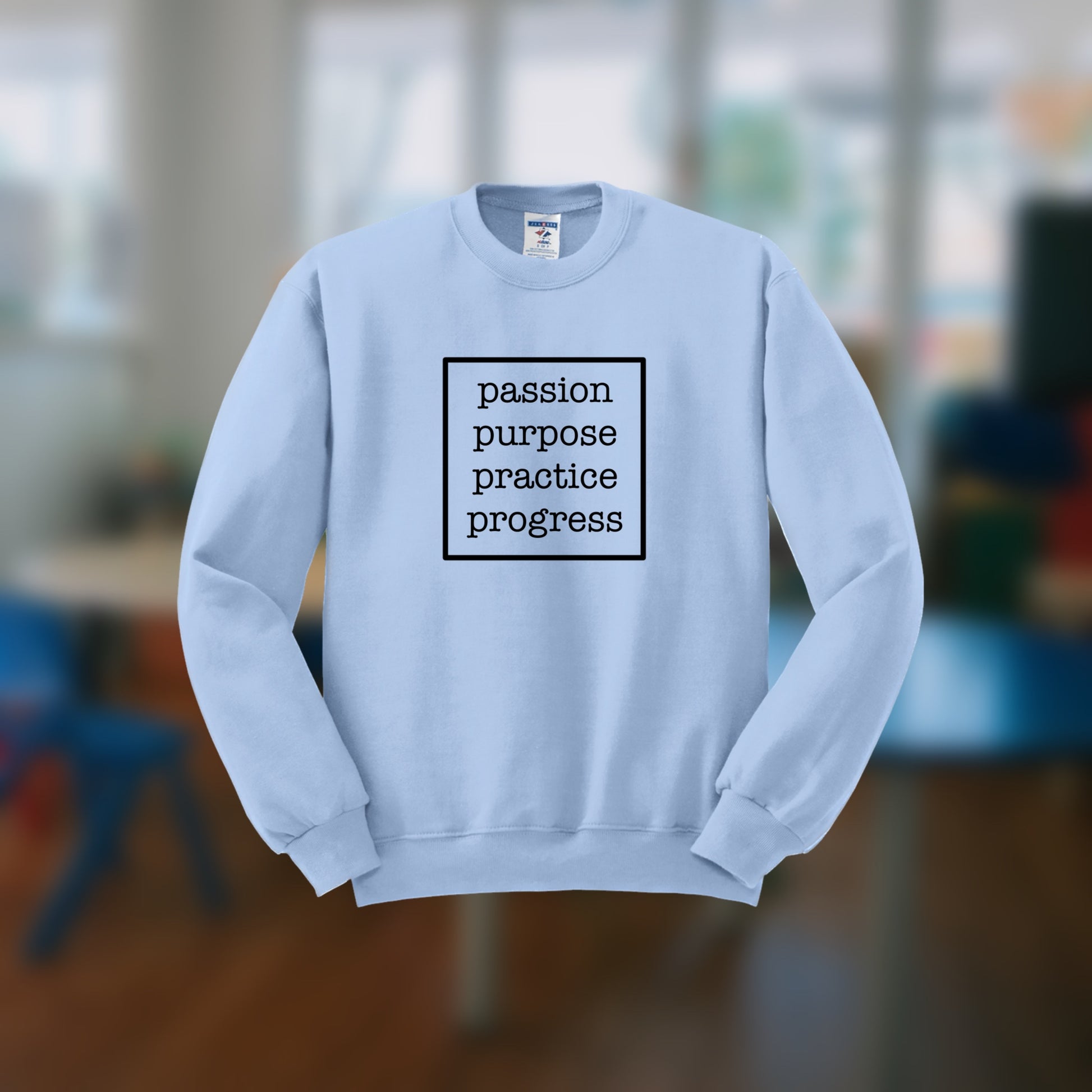 The black text on the apparel reads "passion, purpose, practice, progress," with a black outlined box around it symbolizing this structured recipe for personal success. Begin by finding your passion, let that drive you to find your purpose, practice more than anyone you know, and celebrate the progress you make no matter how small.